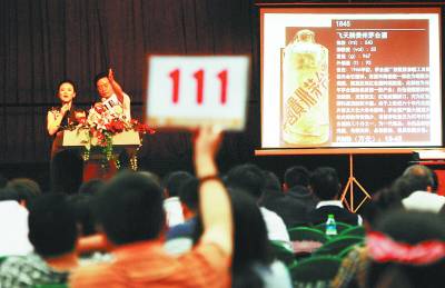 9月25日举行的江西首届陈年茅台酒拍卖会上,竞拍者在对陈年茅台酒进行竞拍。一瓶1966年产的茅台酒以最高30万元成交,其余近百瓶上世纪七八十年代的茅台酒也都基本成交。