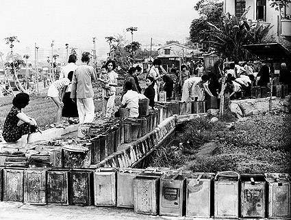 1895年,1929年,1963年……水荒笼罩下的香港,港府屡次宣布“制水”(即限时供水),洗澡、洗衣都成了问题。全家人提着水筒,到街上轮流排队取水,成了一般港人生活的重要环节。“因为轮候争水,街坊反目,甚至闹上法庭的事情都有,‘楼下关水喉’更多。”爷爷不止一次念叨。