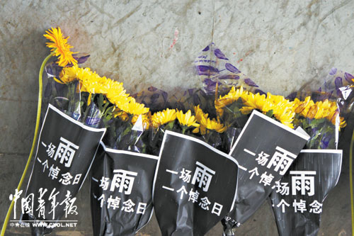 7月27日,北京广渠门桥下,市民摆放鲜花祭奠“7·21”暴雨中的遇难者。本报记者 郑萍萍摄