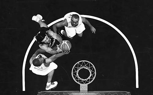 当地时间7月31日,法国队和阿根廷队在伦敦奥运会男篮比赛中交手。图为在NBA效力的法国球员帕克(上)和阿根廷球员斯科拉(中)在比赛中激烈拼抢。CFP供图