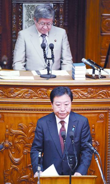8月24日,日本众议院举行全体大会,通过了抗议韩国总统李明博登独岛(日本称“竹岛”)和要求日本天皇谢罪等言行的决议案。图为日本首相野田佳彦正在发表讲话。 CFP供图