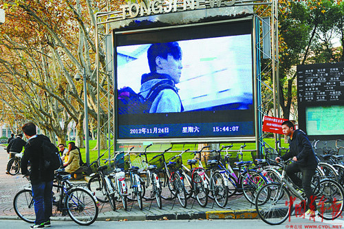 11月24日,同济大学校园里正在播放专为第八届“挑战杯”全国大学生创业计划大赛制作的宣传片,以“向挑战者致敬”。