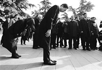 “我为日本兵当年在中国犯下的罪行道歉。”以私人身份访华的日本前首相鸠山由纪夫,面对着南京大屠杀遇难者的遗骨,双手合十,低下了头。