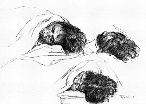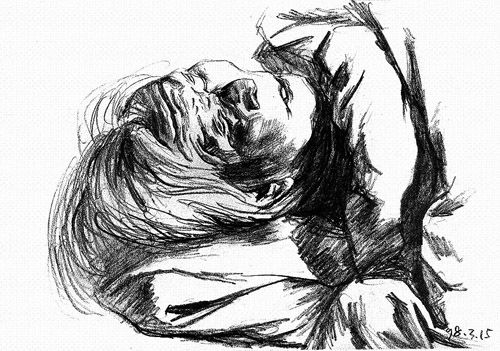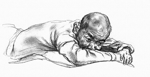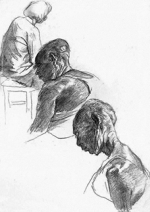 这些画纸有大有小,有干净整洁的,也有被弄脏和折起的。有时画家把铅笔削得很尖,画出的线条纤细尖锐;有时他来不及削笔便匆匆作画,留下粗重潦草的轮廓。有的画很完整,人躺在病床上,面容和身形都被细致描绘;有的画刚落几笔病人就离开了,只有一双眼和半张脸。