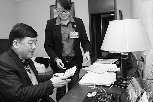 3月13日,江苏代表团驻地,大学生村官代表朱虹(右)请全国人大代表、江苏省副省长徐鸣在两会纪念封上签名。朱虹表示,这些签满同团代表名字的纪念封,将作为礼物送给家乡的其他大学生村官。