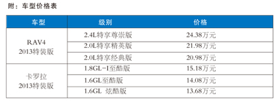 新春伊始,各汽车品牌纷纷发力,以期在2013年拔得头筹。国内重要汽车品牌一汽丰田率先出击,隆重推出卡罗拉、RAV4、威驰2013特装版车型,3款特装车不仅外观内饰更加时尚炫酷,在安全性及性价比方面也大幅提升。与此同时,针对3款特装车的“超值特装‘值’为你”促销活动也将于3月1日至4月30日期间展开。 性价比提升 卡罗拉2013特装版更超值 本次卡罗拉新推出的1.6GL至酷版和1.8GL-I至酷版两款2013特装版车型,分别是在此前1.6GL炫装版和1.8GL-I炫装版基础上增加了黑色内饰和真皮座椅,其中1.6GL至酷版还增加了D席上下调节功能。由此,卡罗拉将由原来的两个排量5款车丰富至6款,为消费者提供更为多样的选择。 有“最值得信赖家庭车”美誉的卡罗拉,每一次提升都完美契合时代需求,与时俱进地为消费者打造高品质汽车生活。 2013特装版车型配备了具有烟熏效果的前大灯和深灰色涂装轮毂,“烟熏”这一潮流元素令卡罗拉更显潮流个性;同时,黑色内饰的选用营造出了劲酷十足的氛围,使其更符合年轻时尚消费人群的选择,而真皮座椅的增加更凸显出卡罗拉整车的品质感;此外,多媒体导航系统等配置的采用则大幅提升了卡罗拉的实用性和性价比。 个性依旧 RAV4 2013特装版更炫酷 RAV4 2013特装版共计两个级别3款车型,即:2.0L特享精英版、2.0L特享经典版和2.4L特享尊崇版,3款车型分别在此前的2.0L豪华版、2.0L经典版和2.4L豪华炫装版基础上升级而来,此次推出特装车后RAV4共有两个排量6款车型可供消费者选择。 此次RAV4 2013特装车也均追加了黑色内饰,营造出炫酷时尚的车内空间,真皮座椅的采用让RAV4在内饰品质上大大超越同级别车型;而车身稳定性控制系统(VSC)、牵引力控制系统(TRC)及CSA帘式气囊等安全配置让RAV4能够实现卓越的安全护卫;此外,2.4L特享尊崇版车型还增加了智能钥匙、电动折叠后视镜、6眼驻车雷达等人性化配置,售价却保持不变。 作为一款性能卓越的城市SUV,RAV4自2009年国产上市以来便以过硬的品质赢得良好口碑。此番推出的2013特装版不仅在外观上延续了此前炫装版车型的炫酷时尚,超大宽适的车内空间亦十分实用,带AUTO/LOCK模式的4WD系统带来畅行无阻的越野体验,上/下坡辅助控制系统(HAC+DAC)、大灯自动控制系统、6探头驻车雷达、SRS空气囊等安全配备让驾乘者更安心,而此次新增的智能钥匙则让驾驶者悦享人性科技。 值得一提的是,除了以上于3月1日推出的卡罗拉和RAV4“超值”车型,将于4月1日面世的威驰2013特装版也同样值得期待! 超值特装 超“值”为您 促销活动更给力 为庆祝卡罗拉、RAV4和威驰2013特装版车型的上市,一汽丰田将于3月1日~4月30日推出“超值特装‘值’为你”主题促销活动。 活动期间来店试驾任意车型即可获得价值100元的精美礼品一份——单声道蓝牙耳机、真空运动瓶、泰迪熊玩偶、米奇炫紫魔术枕随你心意,12万份等你来拿;参与试驾的消费者还有机会抽取2000份价值3000元的ipad mini幸运大礼!同时,威驰2013特装版待4月1日上市后也随即加入此次促销活动。 新春已至,先有一汽丰田为您倾情推出的3款主力车型超值特装车,再加上特惠促销活动,感兴趣的朋友一定不要错过购车良机! |