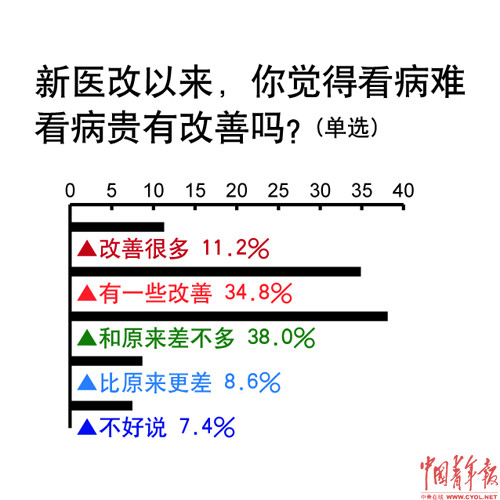 本报讯(记者王聪聪)中国青年报社调中心日前通过题客调查网进行的一项调查显示,46.0%的人感觉新医改以来看病难、看病贵有所改善,8.6%的人持相反态度,38.0%的人感觉和原来差不多,7.4%的人表示“不好说”。全国31个省(自治区、直辖市)8090人参与调查,18~45岁的青年占89.5%。 进一步分析发现,不同地区的公众感受有所不同。认为看病难看病贵有所改善的,农村居民多于城市居民。调查中,28.3%的人感觉当前医患关系较好,59.6%的人持相反观点,12.1%的人表示“不好说”。 公众期待两会推动哪些医疗问题进一步改革?63.1%的人希望提高医保报销比例;59.2%的人建议完善大病医疗补助制度;55.7%的人期待医保覆盖更大范围人群。接下来还有:建立疾病应急救助制度(49.3%);革除以药补医弊病,杜绝过度医疗(48.0%);实现先看病后付钱(41.5%);实现全国医保统筹,解决异地就医结算难题(41.4%);扩大医保范围,增加康复护理保险(39.8%);取消公务员公费医疗制度,全面加入医保(38.3%);促进小病在社区和乡镇卫生院就医习惯形成(34.0%);解决“医闹”问题,保障和谐医患关系(30.5%);推进医生多点执业(29.8%)等。 |