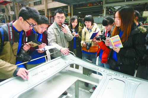 车展前夕,大学生记者团走进一汽大众长春汽车制造基地,参观了一汽大众二厂的冲压、焊装、组装3个车间,近距离观看了一汽大众这个国内汽车巨头的生产细节。材料放置合理、物流高效、科技含量高、所有资源优化合理配置,是我眼中的最大亮点。