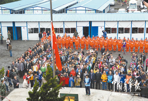 在升旗仪式上,四川省副省长黄彦蓉宣布:灾区学校由此复课。