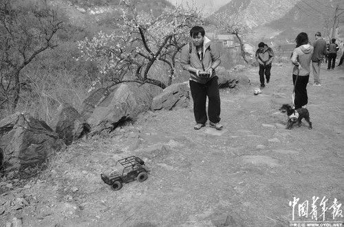 遥控小汽车在古道上奋力爬坡