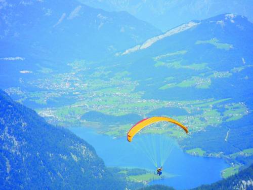 然而,眼前缓缓掠过的滑翔伞告诉我们,有人真的在山间飞翔。这里的滑翔伞并非景区的旅游项目,而是爱好者在自由地乘风高飞。山坡上不时可见三三两两的年轻人背着伞包徒步而上,寻到一片开阔地,等待山风鼓满伞翼,再调整好角度,顺着山坡往下助跑几步便腾空而起,与蓝天白云融为一体。雪峰静谧,这些年轻的伞客们如跃动的火焰点燃阿尔卑斯的激情,又如翱翔的雄鹰在碧空如洗的天幕中划出无声的惊雷;而他们身下,哈尔施塔特湖泛出幽幽的蓝光,山谷青翠舒展,村庄错落有致,人间烟火的温情与俗世生活的幸福在安静地等待这些高飞的灵魂们稳稳降落,以及,再一次起飞。