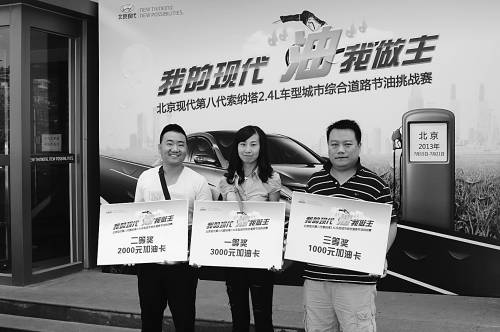 本报讯(记者钟天骐)近日,由《新京报》、网易汽车和北京现代联合举办的第八代索纳塔2.4L车型城市节油挑战赛(北京),在北京现代波士山特约销售服务店举行了颁奖典礼,这项历时一周的城市节油挑战赛最终成绩也出炉:康颖女士以百公里5.52L的成绩在近百名参赛者中脱颖而出获得冠军,赵宁和魏杰以百公里5.68L和百公里5.73L的成绩分列二、三位,三位选手都获得了主办方颁出的大奖。