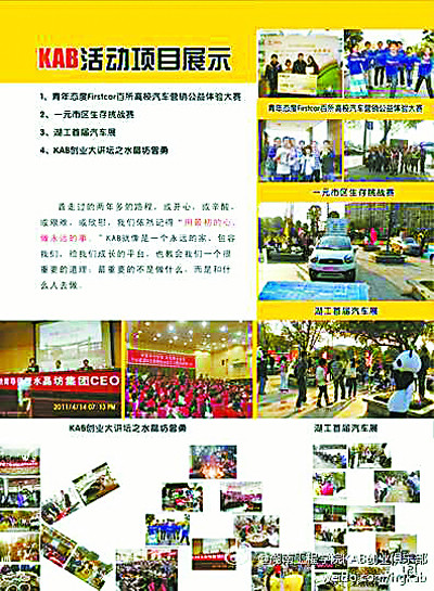 湖南工程学院KAB创业俱乐部:湖工KAB创业俱乐部2013新生特刊1000册已发放完毕。招新也即将开始,敬请关注。