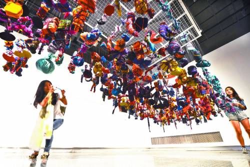 9月20日,在杭州国际纤维艺术三年展媒体预展上,参观者在欣赏英国艺术家阿莉娜·阿扎德的作品《礼物(100—999)》。杭州国际纤维艺术三年展于9月21日在浙江美术馆和中国丝绸博物馆同时开幕,共展出来自16个国家和地区的45位艺术家的100余件作品,展期两个月。