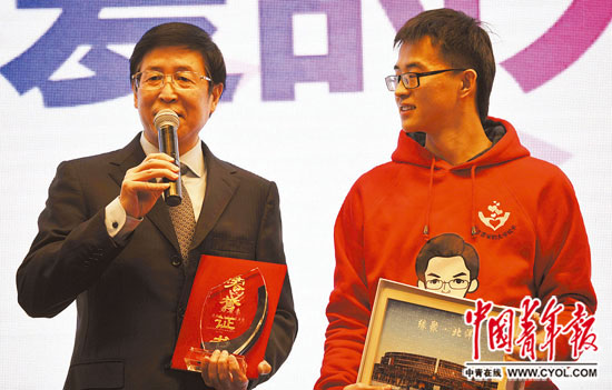 南京工业大学大一新生朱祎昀没想到“天上真会有馅饼掉在头上”,他“临危受命”要给校长颁奖,之前,他只在开学典礼上远远看到校长的影子。为校长颁奖时,朱祎昀拿起奖杯时手一直在抖。