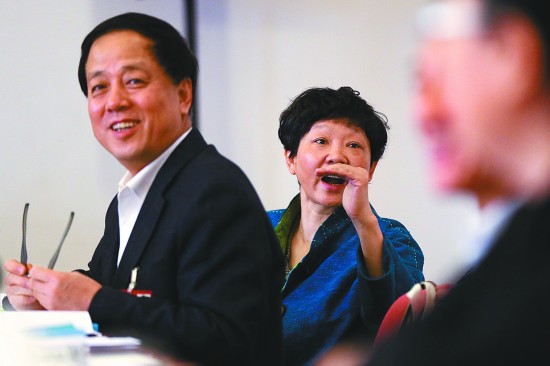3月8日,全国政协十二届四次会议小组讨论,全国政协常委、九三学社中央副主席印红(右)发表观点。她表示,应对长江流域水环境污染实行系统治理和综合治理,立足山水林田湖生命共同体,统筹自然生态各要素,把沿江与沿山、沿林、沿田有机结合起来,从涵养水源、修复生态入手,统筹上下游、左右岸、地表地下、城市乡村、工程措施和非工程措施,协调解决水生态和环境保护问题。中国青年报·中青在线记者 赵迪/摄