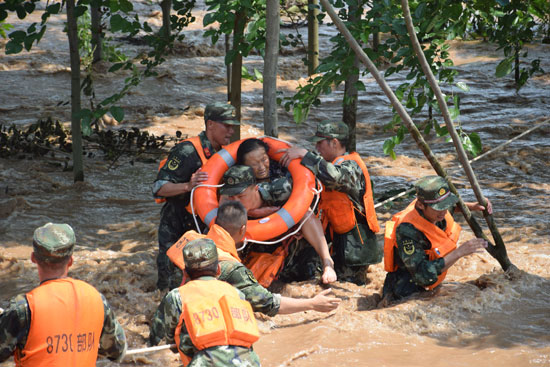 2016年7月,湖南岳阳新华垸溃堤,参加抢险救援的武警8730部队官兵不顾个人安危,紧急转移群众。
