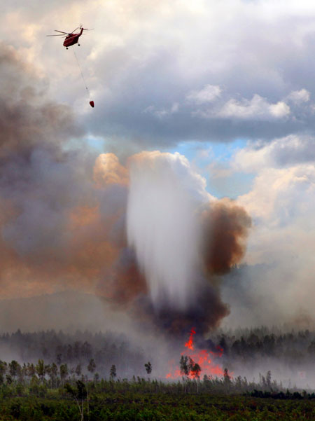 武警森林部队出动直升机吊桶灭火。