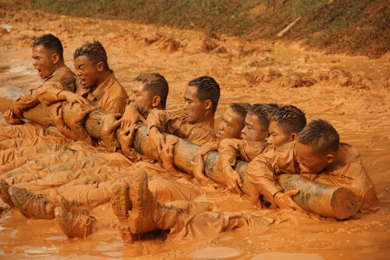 3月20日至26日,武警广东省总队组织数百名特战队员展开为期一周的“魔鬼周”极限训练。图为特战队员在泥潭里进行圆木托举训练。武警部队政治工作部宣传局供图