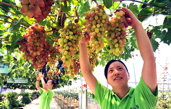 7月23日,徐云丽(右一)在大棚摘提子。她大学毕业后回乡创建了安徽清水河农场1.5万平方米的高效连栋温控大棚,提子喜获丰收。当日,庐江台创园第四届提子采摘节暨清水河鲜葡萄酒庄落成典礼举行,徐云丽夫妇向4名贫困学生捐赠了扶贫助学金。周跃东/摄