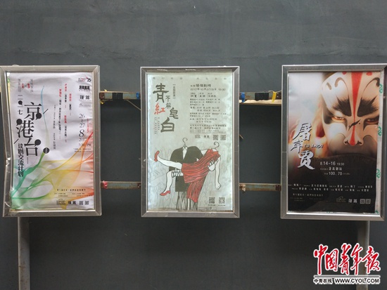 蓬蒿剧场门口的戏剧海报。蒋肖斌/摄