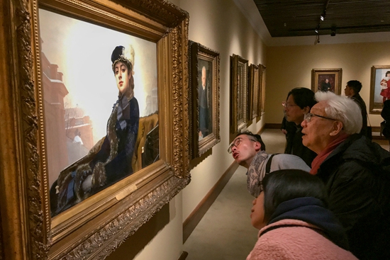 2017年12月14日至2018年3月4日,中俄联合主办的“巡回展览画派:俄罗斯国立特列季亚科夫美术馆珍品展”在上海博物馆展出。图为中国观众如痴如醉地观看克拉姆斯柯依的油画《无名女郎》。