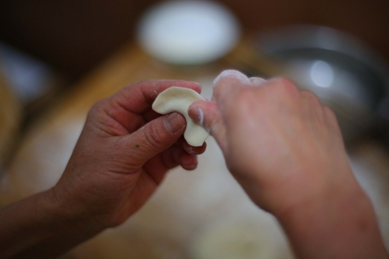 一位家政工正在熟练地包饺子。
