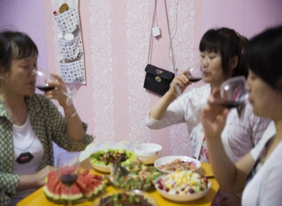 陈述琼、陈恩华和陈会蓉在出租房里喝着红酒。