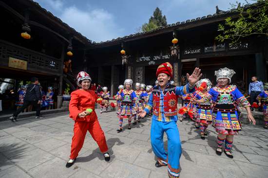 4月8日,湖南永顺举行2018“金芙蓉”杯国际广场舞大赛,众多广场舞参赛队伍身着华丽的民族服饰来到永顺芙蓉镇的大街小巷载歌载舞。视觉中国供图