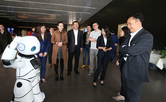 与传统4S店不同,广汽新能源25hours北京富电体验中心拥有丰富的高科技陈设。广汽新能源汽车有限公司总经理古惠南(右一)与展厅的智能机器人互动。资料图片