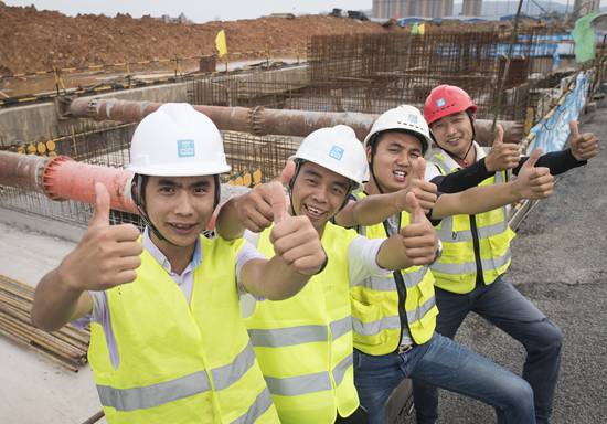 5月14日,武汉黄家湖大道城市地下综合管廊及同步道路提升改造工程项目的年轻施工员在工程现场合影。武汉黄家湖大道城市地下综合管廊及同步道路提升改造工程包括地面的道路改造和地下综合管廊建设,是第七届世界军人运动会重要配套工程之一。自去年7月开工以来,有不少90后员工陆续入驻工地。新华社记者 肖艺九/摄