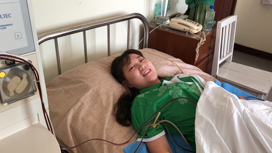 5月20日上午,赫采第一次注射动员针。进行造血干细胞采集之前需要进行7次注射,她出现发烧、疲惫等暂时的副作用,但赫采没丝毫怨言。为了不耽误学业,成绩保持在年级前5名的赫采还坚持通过同学发来的课堂视频学习,写作业和实验报告。