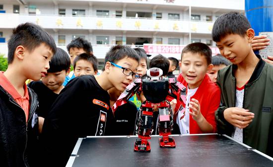 2018年5月23日,四川省华蓥市高兴镇小学的孩子们在观看机器人表演。 视觉中国供图