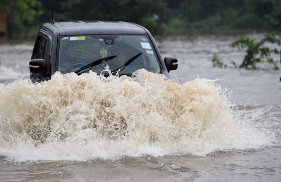 5月23日,在斯里兰卡比耶加默,当地居民驾车行驶在积水的道路上。斯里兰卡灾难管理中心24日表示,从本月19日开始的暴雨天气已经造成斯全国范围内12人死亡、超过12万人受灾。新华社/法新