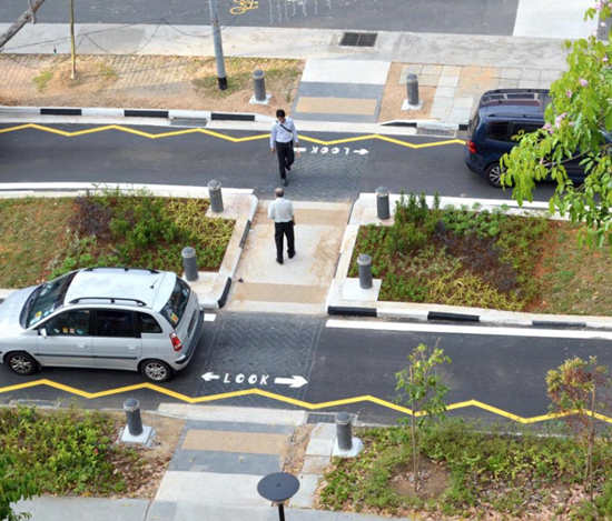 在新加坡,人行横道会在路中心的绿化带设置“休息点”,方便老人穿行。在这些特殊区域,机动车道会使用道路变窄、绘制闪电标识等方式,引导车辆放慢速度,保证步行者的人身安全。