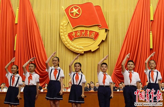 6月26日,中国共产主义青年团第十八次全国代表大会在京开幕,少先队员献词后敬礼。中国青年报·中青在线记者 陈剑/摄