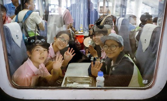 当日,江西省南昌市第十七中学西藏班的155名藏族学子在老师的护送下,从南昌站和南昌西站出发返藏探亲。正值暑运高峰,车站工作人员不仅前往学校为返藏学生讲解旅行常识和注意事项,还为返藏学生开辟绿色通道,并指派专人全程护送进站上车。周光辉/摄(新华社发)