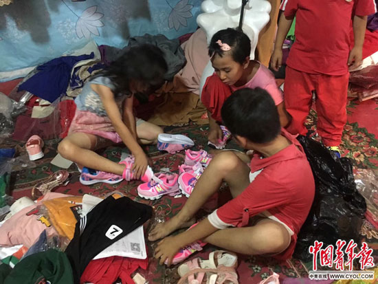 又有几双小脚跨过商店的小门,有的小脚身后还跟着一双大脚——孩子的母亲或祖母闻讯赶来。训练营导师和大学生记者牵起身边的孩子,加入找鞋、试鞋的行列。
