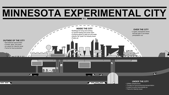 斯沃塔拉的几乎所有居民都以为这是个笑话。但是,包括建筑师巴克明·斯福勒在内的数百位专家都加入了阿瑟斯坦·斯皮尔豪的后援团,福特、波音、霍尼韦尔等公司的大佬们也卖了他面子,纷纷投资。计划也在明苏尼达州政府顺利通过,预算定为40亿美元。