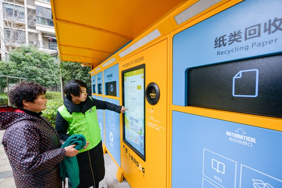 1月7日,浙江省湖州市长兴县龙山街道领域龙山小区内,住户正在使用智能垃圾分类回收机。视觉中国供图