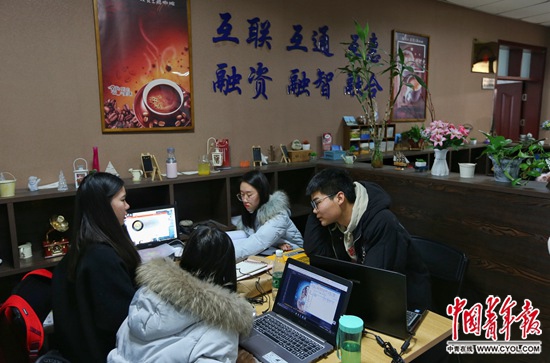 1月6日,南阳理工学院创业大学生在“融资、融智、融合”众创空间里交流。