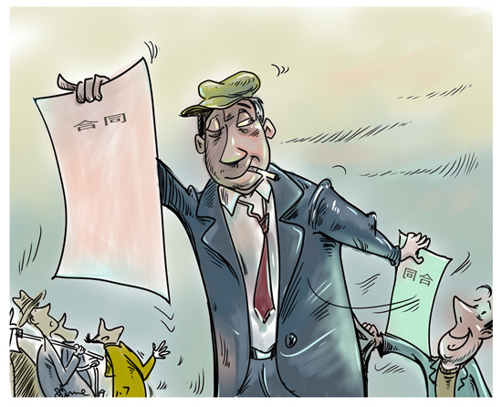 2018年年底,湖北省宜城市纪委监委查实该市流水镇黄岗村原党支部书记陈泽献涉嫌倒卖土地使用权职务违法问题。陈泽献在参与矿石开采亏本之后,利用担任村党支部书记的便利,炮制虚假承包合同,非法获利。目前,宜城市纪委对其下达了开除党籍处分决定书。(《中国纪检监察报》1月5日)漫画:徐简