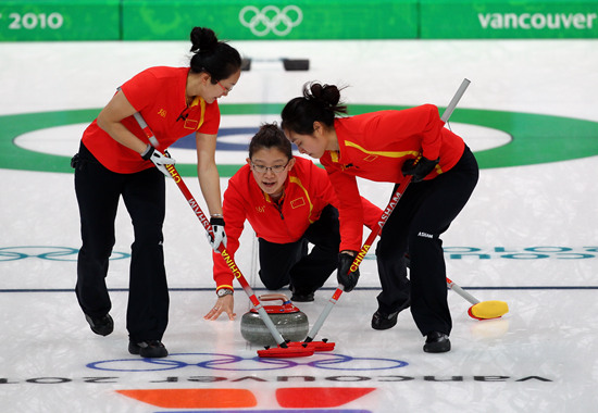 2010年2月17日,2010年温哥华冬奥会女子冰壶第二轮,王冰玉(中)领衔的中国队在对英国队比赛中。中国队最终获得该届冬奥会女子冰壶铜牌。视觉中国供图