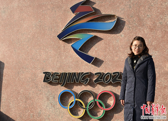 王冰玉在北京冬奥会会徽前留影。中国青年报·中青在线记者 慈鑫/摄