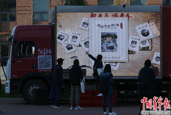 •     4月29日,山东青岛,中国海洋大学崂山校区,同学们在“时光宝盒”前举行快闪活动,唱爱国歌曲。中国青年报·中青在线实习生 宋欣然/摄