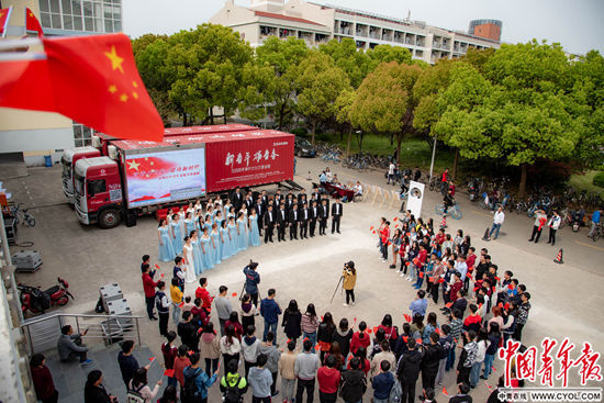 •     4月14日,上海交通大学闵行校区,该校合唱团的同学们在“时光宝盒”前举行快闪活动,歌唱《没有共产党就没有新中国》《我和我的祖国》《五月的鲜花》《毕业歌》《强国一代有我在》等歌曲,引来了众多学生围观。中国青年报·中青在线实习生 宋欣然/摄