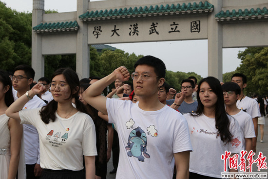 •     4月25日,武汉大学的同学们正在进行主题宣誓,响亮的口号回荡在校园上空。 中国青年报·中青在线实习生 蒋浩田/摄