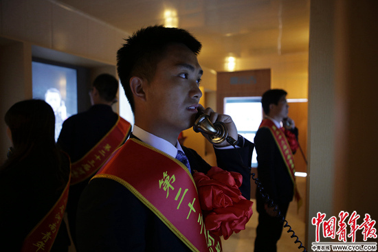 •     4月27日,河南郑州,河南电视台八号演播厅外,“河南青年五四奖章”获得者代表,进入“时光宝盒”重温了100年前中国青年奋斗爱国的故事,并通过时光电话亭中的多部老式电话,与“鲁迅”、“李大钊”、“邓中夏”等五四先驱隔空对话。中国青年报·中青在线实习生 蒋浩田/摄