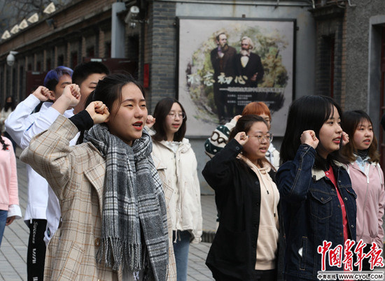 4月9日,在中国青年报社和北京市委教育工委的组织下,来自北京第二外国语学院的50名学生在北京新文化运动纪念馆(北大红楼)前,举行主题团日活动,纪念五四运动100年,并用誓言承诺作为当代年轻人的责任与担当。中国青年报·中青在线记者 陈剑/摄