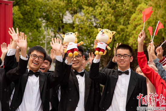 4月14日,上海交通大学闵行校区,该校合唱团的同学们在“时光宝盒”前举行快闪活动,活动中同学们挥舞着国旗和“青小豹”,笑容灿烂。中国青年报·中青在线实习生 宋欣然/摄